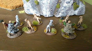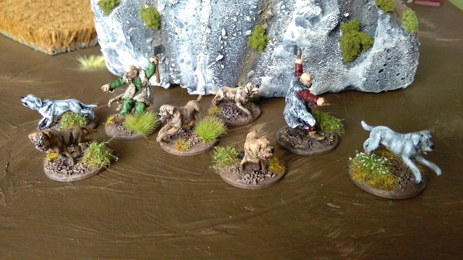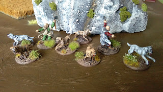 I got my unit of Hounds for the Saxon force all painted and based up. The unit comprises of 7 hounds and pack master, but I got them in 2 packs of 3 hounds and master so I am assuming my unit is rather unruly and requires an additional man to keep em under control.